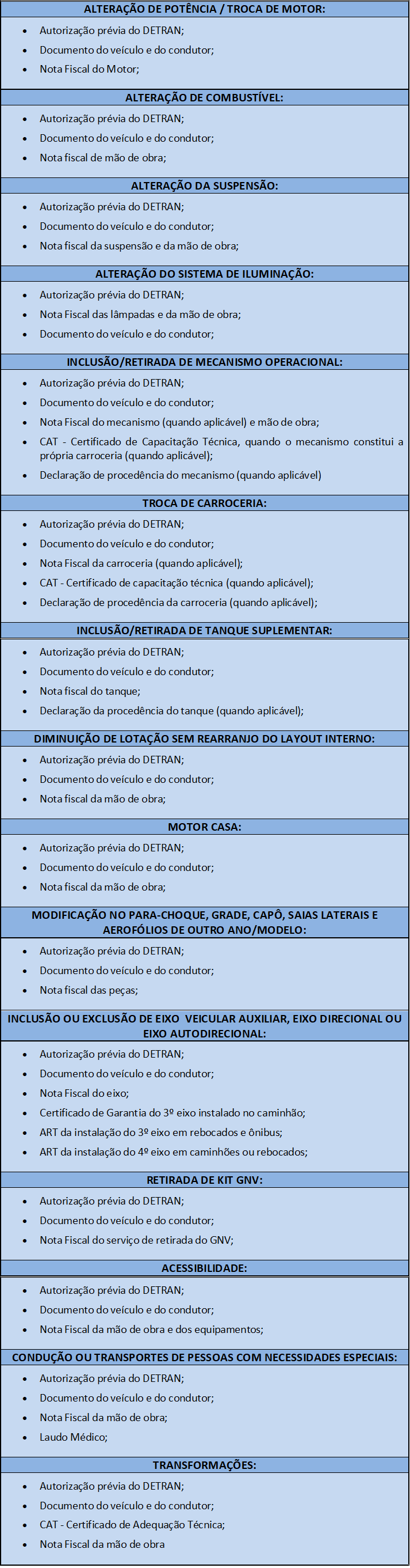 O cliente deverá requerer uma Autorização Prévia da Autoridade de Trânsito (DETRAN), para executar a alteração/modificação. E, após, levar o veículo na Inspecar para ser realizada a inspeção.